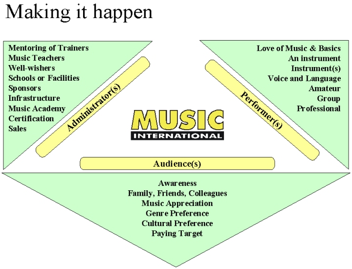 Instrument playing is on the decline. Quality of instrument playing is on the decline. The ONE underlying reason is the EXTREME shortage of Teachers and Quality Education in Music. At Music International a key-focus is talented high-quality teachers and we would be happy to associate with any and all who want to expand music education. From among our students, industry, hobby and amateur performersto those interested in Careers and Music as a Business. Nothing is valued unless value is attached to it ...